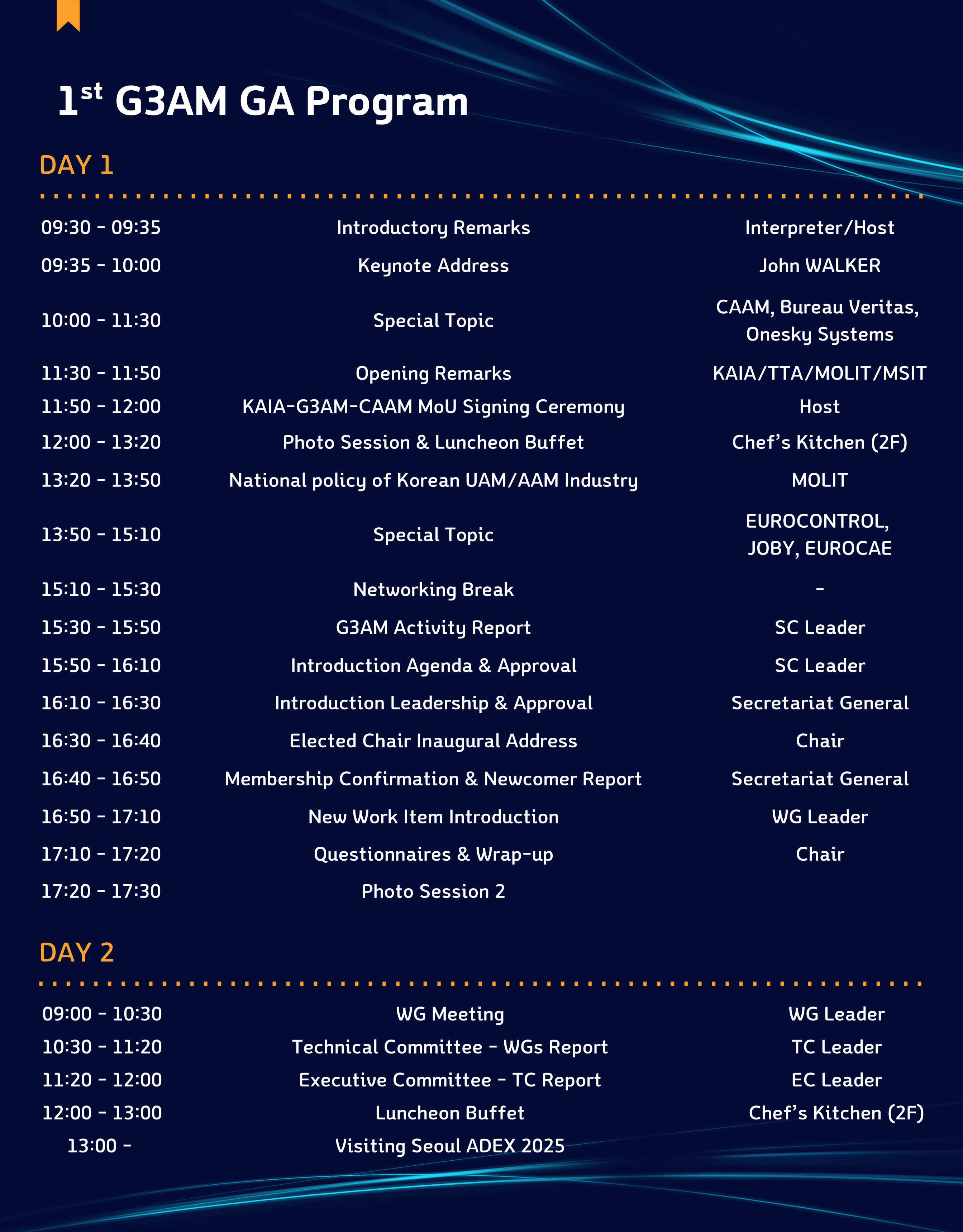 15:30–17:10 Reports, Approvals, New Work Items, MoU Signing (KAIA–G3AM–CAAM)
